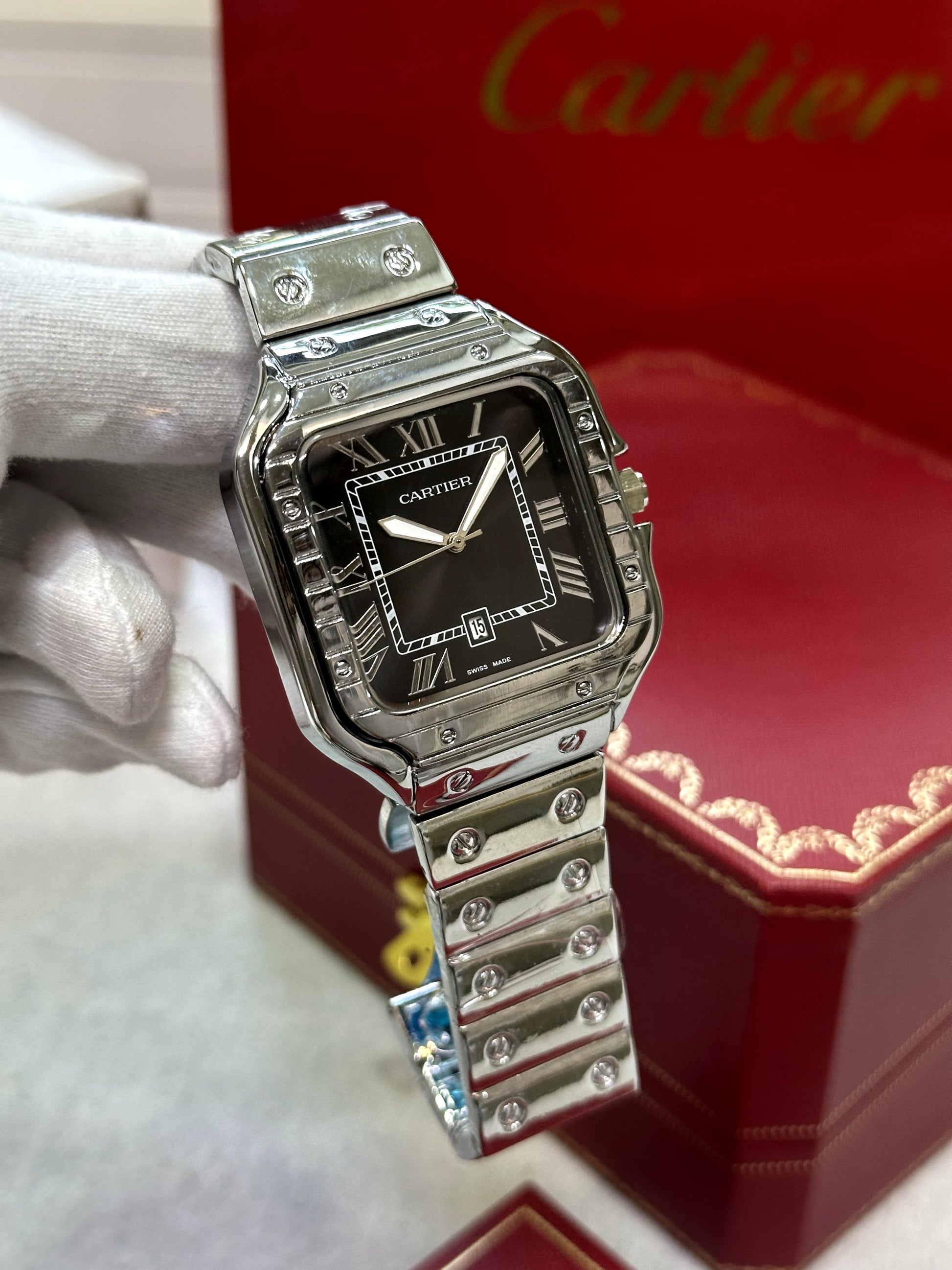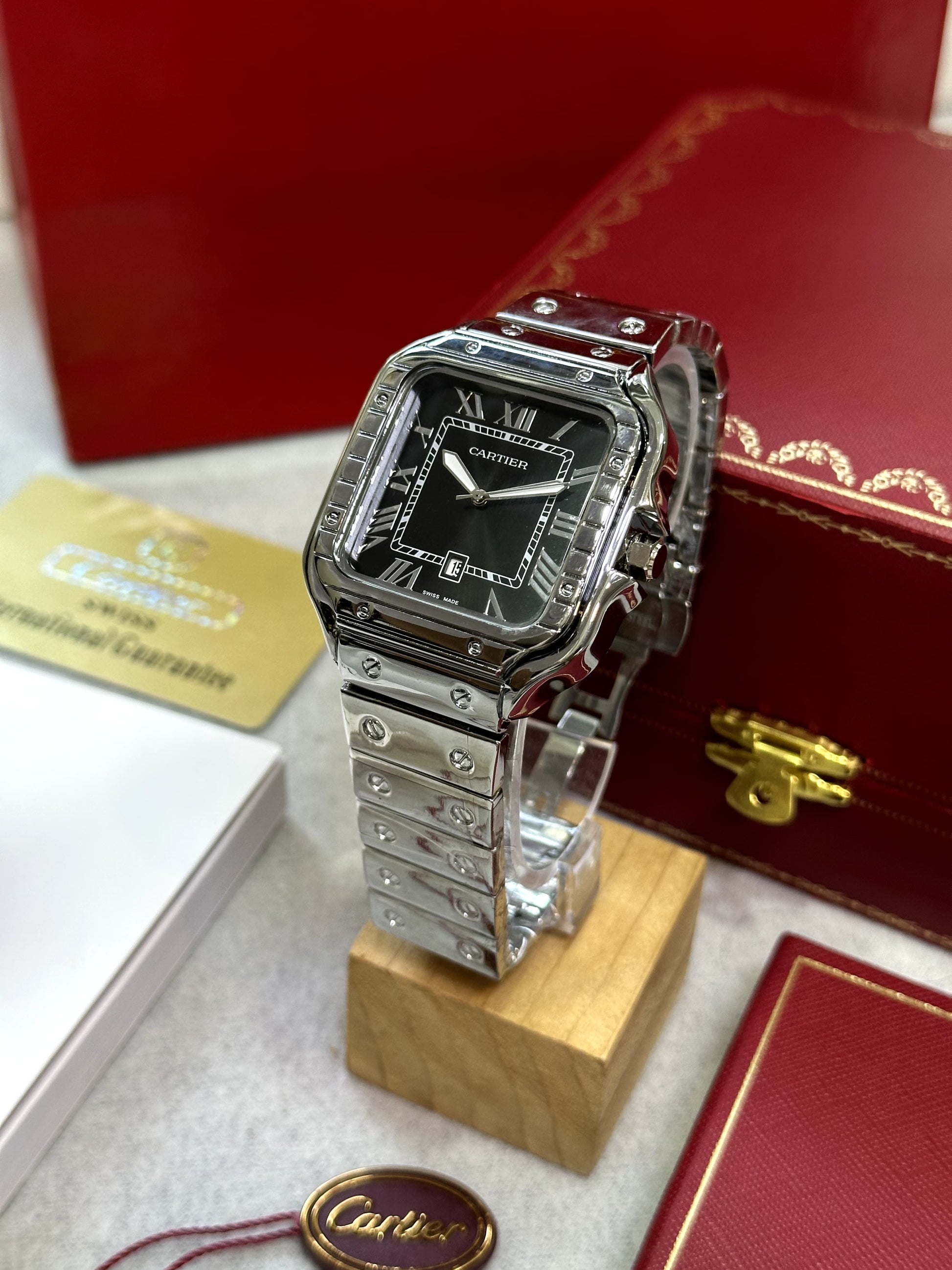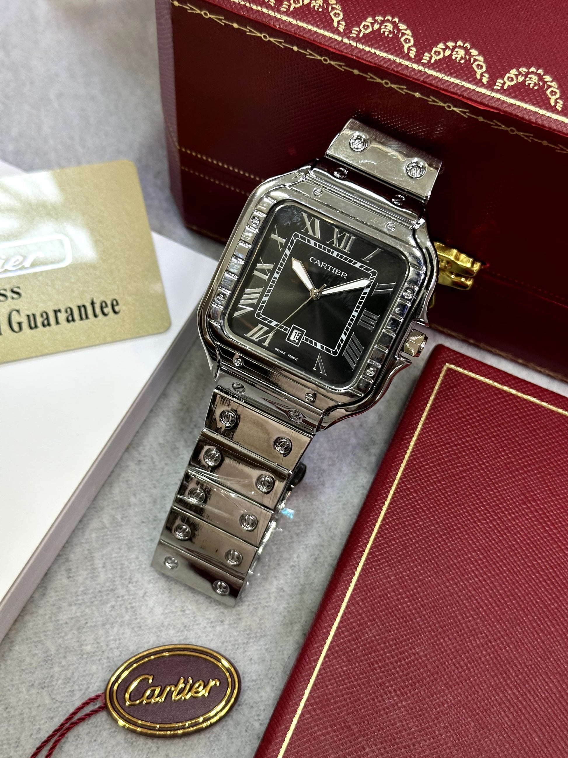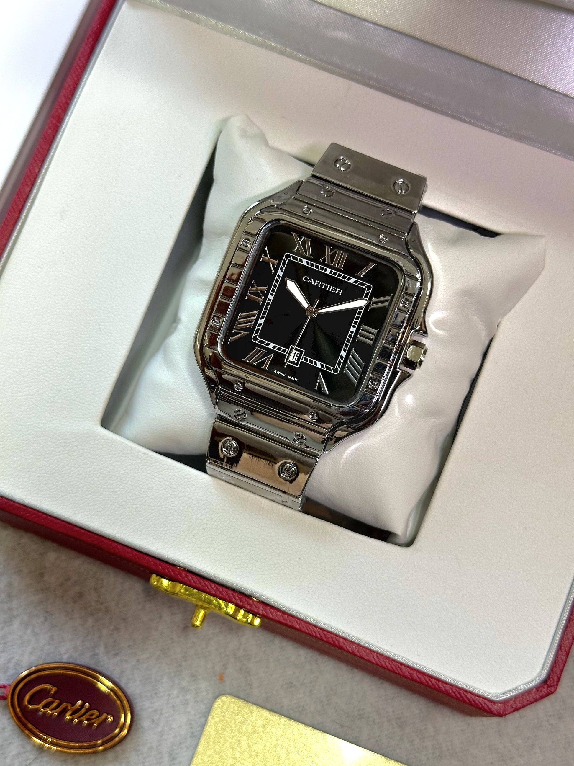 Elevate your timepiece game with Santos De Cartier. Featuring a sleek black dial and premium movement, this stainless steel watch combines form and function. The working date feature, white indicator, and high-end battery-operated machine make this a practical and stylish choice. Complete with a stainless steel silver strap, it's a must-have for any fashion-forward individual.